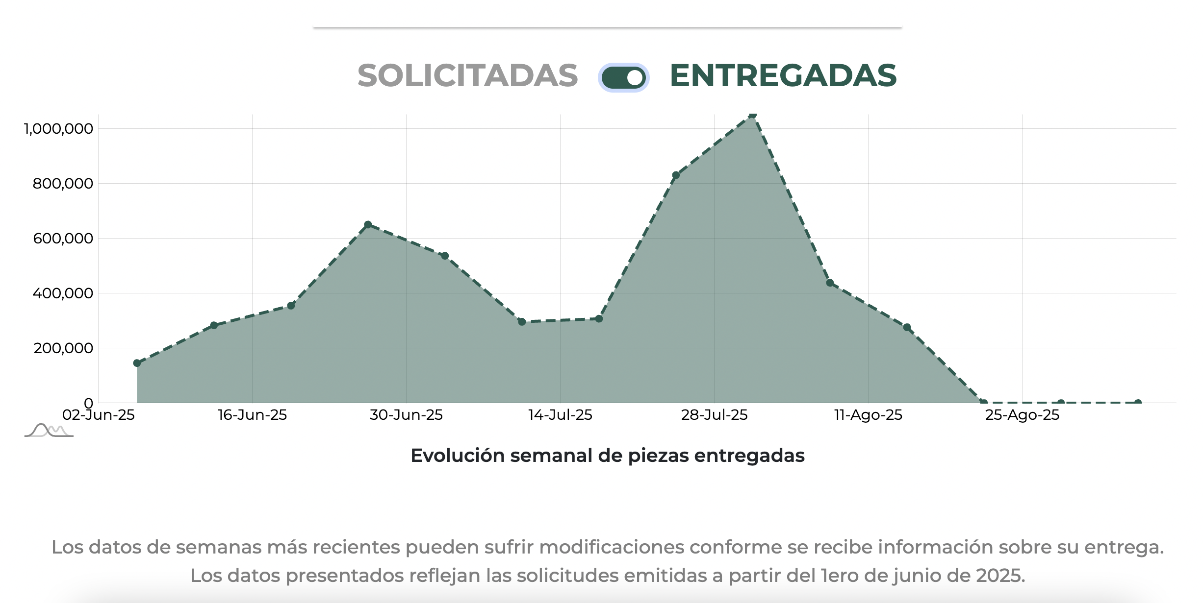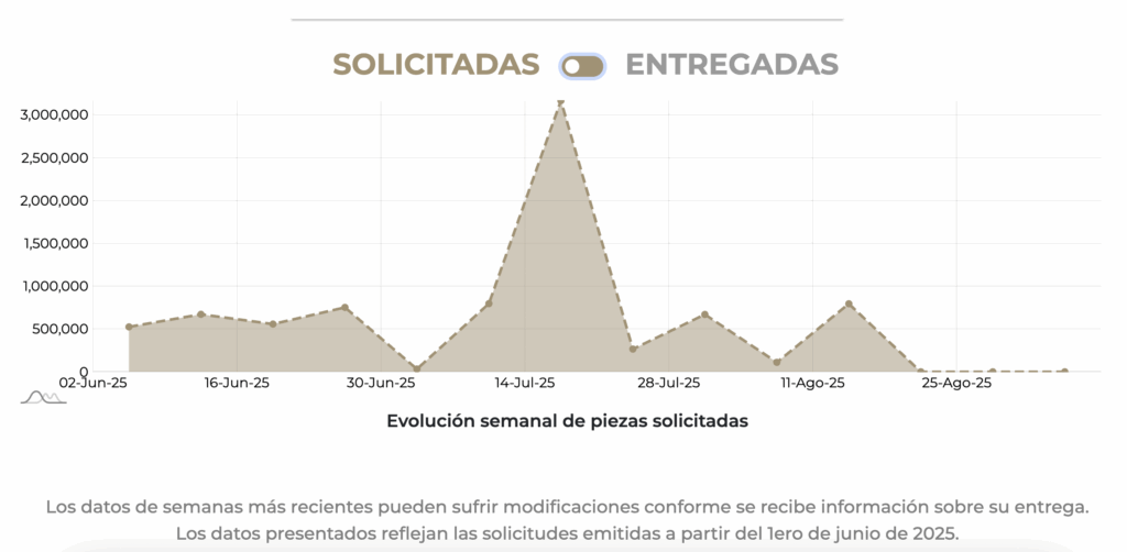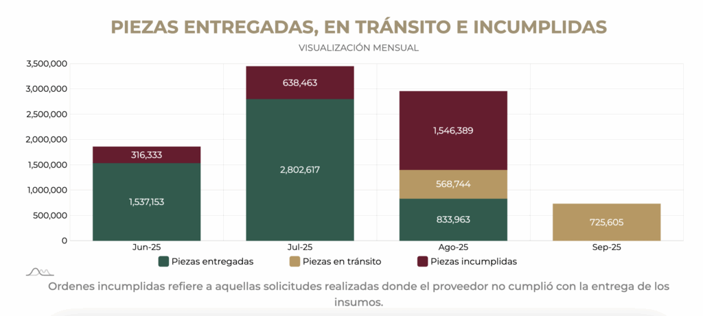 Por ejemplo, del 1 de junio al 15 de agosto, en Zacatecas se registraron 8 millones 338 mil 420 solicitudes de insumos (medicamentos, equipo y/o material), de las cuales en 5 millones 173 mil 733 se cumplió con la entrega y 1 millón 294 mil 349 continúan en tránsito. Eso arroja un total de 1 millón 870 mil 338 solicitudes incumplidas, y este incumplimiento, según la plataforma, sería atribuible a los laboratorios responsables de surtir cada requerimiento.