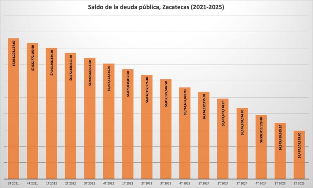 Sin embargo, más allá de los flujos financieros, la principal presión para Zacatecas ha sido la deuda pública y su alto costo, pues además de comprometer casi una tercera parte del presupuesto total del estado (recordemos que en algún momento llegó a superar los 8 mil 300 millones de pesos), limitaba los recursos que se podían invertir en infraestructura o en programas sociales.