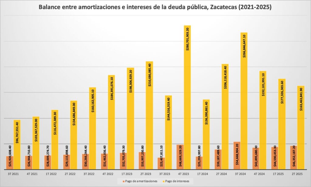 Lo anterior deja ver el altísimo costo que está pagando el estado por una deuda heredada, que tampoco se tradujo en mejores condiciones de bienestar para Zacatecas, pues en cuatro años de administración el pago de intereses ha representado cinco veces más que lo que se canaliza al pago de capital para amortizar esta deuda pública.