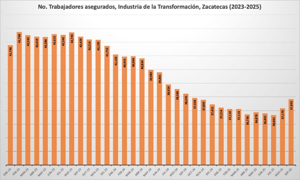 Tan sólo en el mes de septiembre se crearon y/o formalizaron 1 mil 817 empleos, con crecimiento en todas las actividades económicas excepto en la construcción, donde apenas se registró la pérdida de 44 plazas laborales en un mes. No obstante, rompiendo la dinámica negativa, en ese mes creció en 685 empleos el sector de la industria de la transformación, que lleva ya dos meses consecutivos con crecimiento.