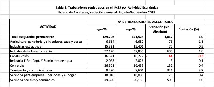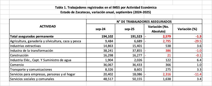De acuerdo con el último reporte del IMSS, al mes de septiembre de este año Zacatecas subió cinco posiciones a nivel nacional en la generación de empleos formales, y aunque todavía se registra pérdida de plazas laborales en el comparativo anual (unos 2 mil 579 empleos), hay indicios de recuperación y ya es un avance abandonar el tercer lugar nacional con mayor pérdida de empleos, una posición que ha ocupado casi todo el sexenio… hasta ayer.