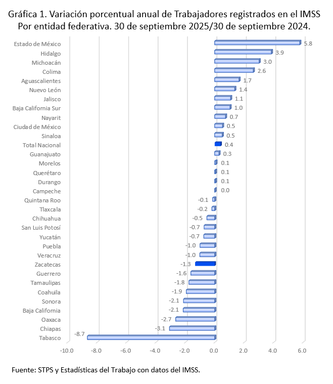 En los últimos doce meses (septiembre 2024 a septiembre 2025) se sumaron 90 mil 879 empleos formales, dieciséis entidades mostraron aumentos, las variaciones más elevadas se observan en el estado de México, 5.8%; Hidalgo, 3.9% y Michoacán, 3.0 por ciento. Zacatecas se ubicó en el lugar veinticuatro con una variación anual de (-)1.3 por ciento. Gráfica 1.