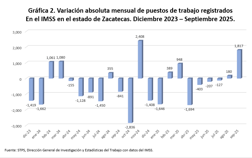 Al cierre de septiembre de 2025 en el estado de Zacatecas se tienen registrados en el IMSS, 191 mil 523 puestos de trabajo. En septiembre Zacatecas presentó un aumento mensual de 1 mil 817 empleos formales, equivalente a una variación mensual de 1.0 por ciento.