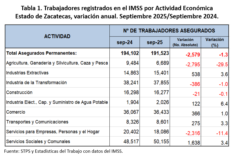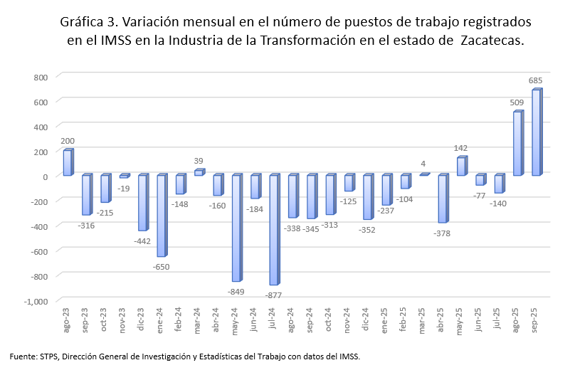 En septiembre de 2025 sólo cinco entidades mostraron variaciones anuales positivas en la Industria de la Transformación: Baja California Sur, Michoacán, Colima, Aguascalientes y Querétaro. Mientras que las caídas más acentuadas se dieron en: Guerrero, Coahuila, Tlaxcala, Sonora, Tabasco, Oaxaca y Ciudad de México. Zacatecas ocupó el octavo lugar con una variación anual de (-)1.0 por ciento.