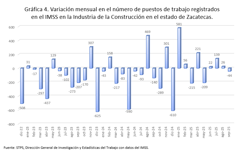 La Construcción del país aglutina el 7.8% del total de empleos formales, Zacatecas participa con el 0.9% de los empleos del país en esta actividad y con el 8.5% de los empleos formales de la entidad. En septiembre de 2025, sólo cinco entidades mostraron crecimientos anuales: Tlaxcala, 27.3%; Michoacán, 10.9% Nuevo León, 5.3%; Baja California Sur, 2.0% y Nayarit, 1.0 por ciento.