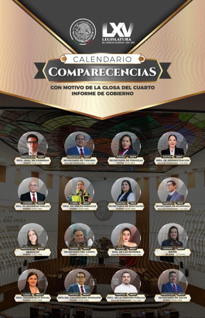 Del calendario aprobado para esta Glosa, 11 comparecencias se realizarán ante el Pleno de la 65 Legislatura, iniciando con el secretario General de Gobierno, Rodrigo Reyes Mugüerza; la secretaria de Finanzas, Ruth Angélica Contreras; el secretario de Seguridad Pública, Arturo Medina Mayoral; la secretaria de Obras Públicas, Mildret Karla Montes Incháurregui; la secretaria de Educación, Gabriela Pinedo; la secretaria de Desarrollo Urbano, Luz Eugenia Pérez; el secretario del Campo, Gerardo Luis Viramontes; la secretaria del Agua y Medio Ambiente, Susana Rodríguez; la secretaria de Desarrollo Social, Bennelly Hernández; el secretario del Zacatecano Migrante, Iván Reyes Millán; y el secretario de Salud, Uswaldo Pinedo Barrios.