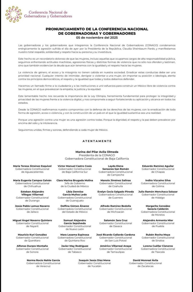 Y en el colmo del cinismo, este pronunciamiento en respaldo a la presidenta Claudia Sheinbaum contrasta con el silencio cómplice ante la brutalidad policiada de la que fueron víctimas las mujeres que se manifestaron durante la marcha del 8M en el 2024.