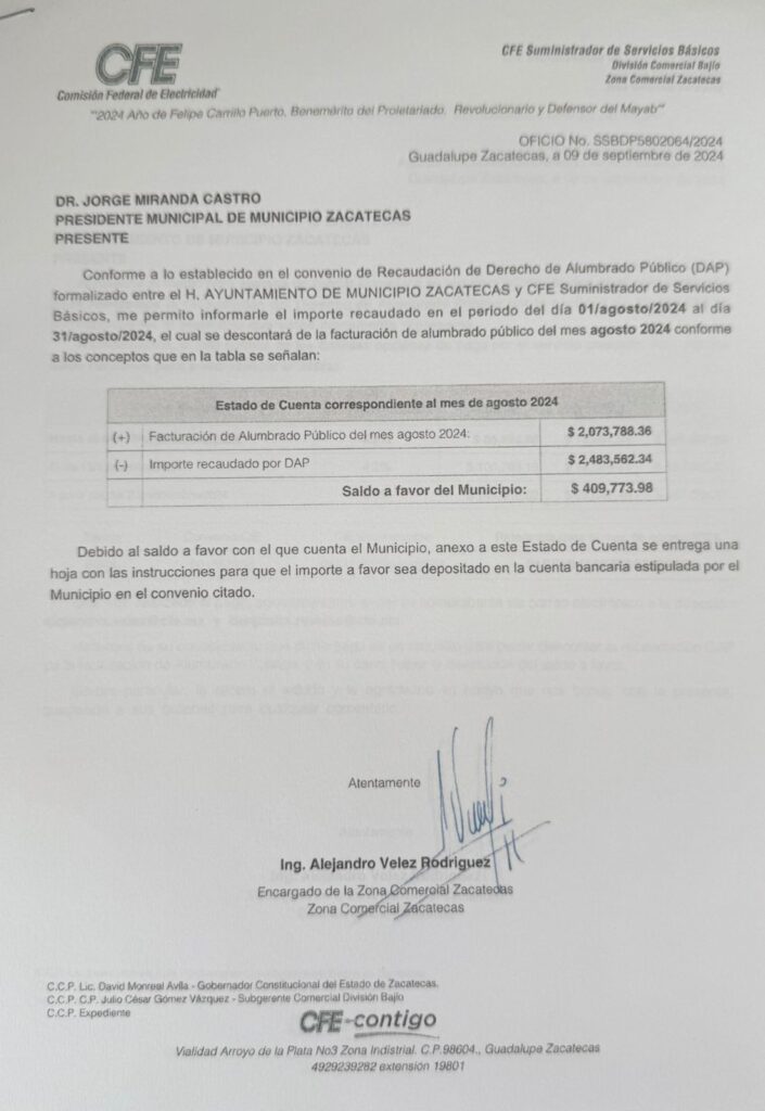 Nada más que existe un documento firmado el 9 de septiembre de 2024 (o sea, días antes del cambio de administración) en el que la CFE informa que al mes de agosto (último corte) el Ayuntamiento de Zacatecas tenía un saldo a favor por 409 mil 773.98 pesos. Y que incluso Varela Pinedo durante el proceso de entrega recepción reconoció en aquel entonces que todo estaba en orden.
