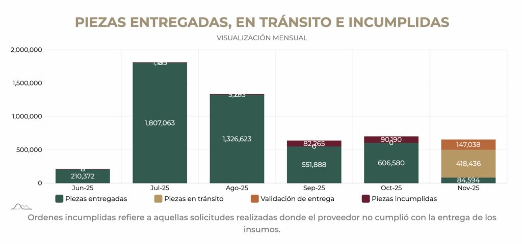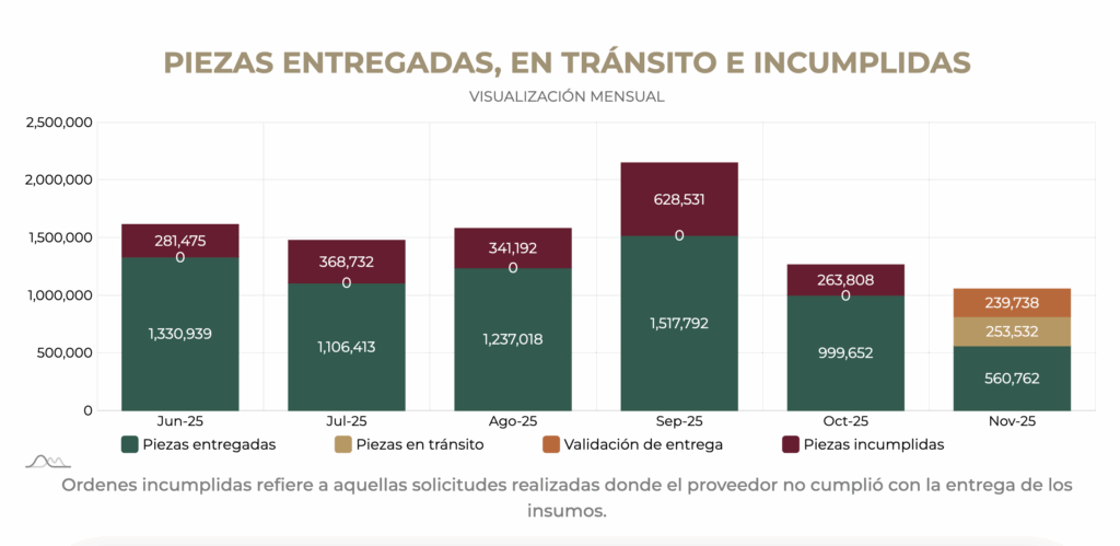 De ese total solicitado por el IMSS-Bienestar, al menos 4 millones 587 mil 120 piezas ya fueron entregadas (86.0% del total, pero sólo 67.9% del total de las piezas entregadas al IMSS), mientras que el incumplimiento alcanzó las 178 mil 941 piezas (3.3% del total del periodo). Y mes a mes, la plataforma muestra que el número de solicitudes ha ido a menos en el esquema IMSS-Bienestar.