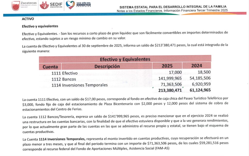 Lo interesante de sus informes contables es el apartado correspondiente a «Efectivo y equivalentes», pues mientras en 2024 reportaban unos 61 millones 124 mil 965 pesos en efectivo, bancos e inversiones temporales (para generar rendimientos), para este año ese monto ascendía a 213 millones 380 mil 471 pesos; es decir, el 39.8% de los recursos recaudados en los primeros nueve meses del año y que permanecían ahí guardados.