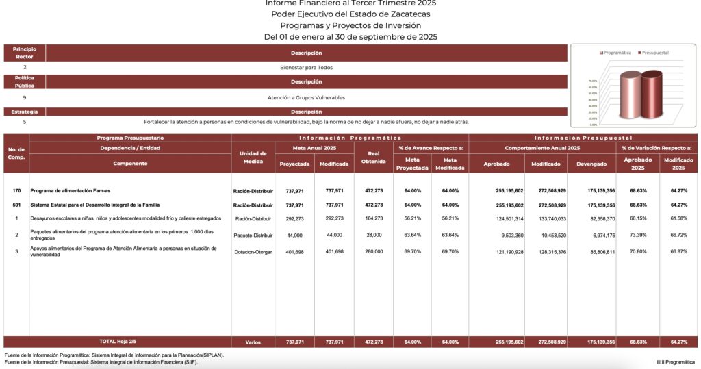 A lo anterior habría que sumar el rezago en el ejercicio de dichos recursos, pues al 30 de septiembre, de los 276 millones 188 mil 46 pesos asignados a la estrategia alimentaria en sus tres componentes, se habían devengado 150 millones 918 mil 610 pesos (54.6%) y quedaban pendientes por devengar unos 126 millones 701 mil 90 pesos. E insistimos: se trata de información oficial con base en sus propios informes financieros trimestrales.