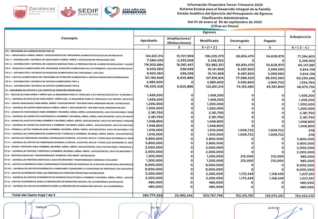 Y las irregularidades se van acumulando. Por ejemplo, en los informes contables del SEDIF reportan que durante el primer semestre de este año tuvieron una ampliación de 75 millones de pesos para el programa de despensas «Corazón Contento», cuando la estrategia alimentaria en sus tres componentes (desayunos escolares, primeros 1,000 días y despensas) apenas tuvo una ampliación presupuestal de 17 millones de pesos, según los informes financieros por programas y proyectos de inversión.