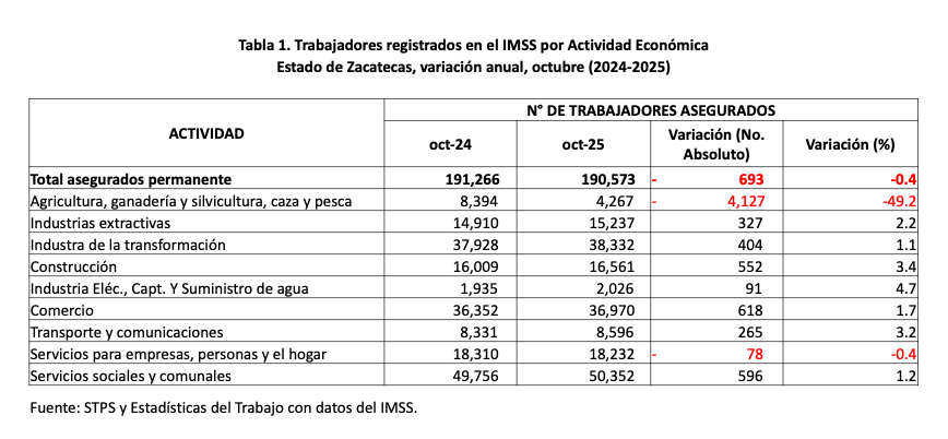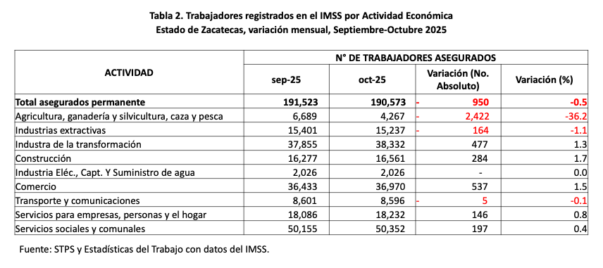 Porque la principal caída en el empleo formal se registró en Agricultura, Ganadería y Silvicultura, Caza y Pesca: 2 mil 422 trabajadores menos en el último mes, y 4 mil 127 en el último año. Y la generación y/o formalización de empleos en el campo ya no depende tanto de la SEZAC, sino más bien de la Secretaría del Campo (SECAMPO) que encabeza Luis Cervantes Viramontes.