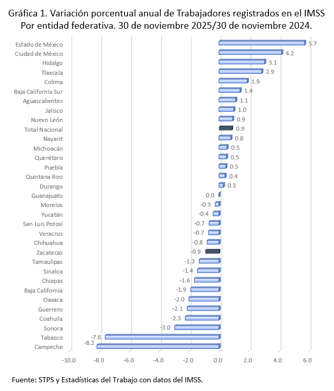 En los últimos doce meses (noviembre 2024 a noviembre 2025) se sumaron 194 mil 130 empleos formales, lo que representa una variación anual de 0.9 por ciento. Dieciocho entidades mostraron aumentos, las variaciones más elevadas se observan en el estado de México, 5.7%; Ciudad de México, 4.2%; Hidalgo, 3.1% y Tlaxcala, 2.9 por ciento. Zacatecas se ubicó en el lugar veintidós con una variación anual de (-)0.9 por ciento. Gráfica 1.