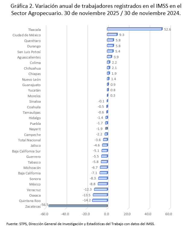 Al mes de noviembre de 2025, la Agricultura, Ganadería, Pesca y Caza, concentra el 3.1% de los empleos del país, Zacatecas participa con el 0.6 por ciento. En el último año este sector registró una contracción de 26 mil 334 empleos equivalente a una variación de (-)3.6 por ciento. Trece estados mostraron aumentos, Zacatecas se ubicó nuevamente en el último lugar al mostrar una variación anual de (-)56.5 por ciento. Habría que preguntarse que está ocurriendo con el campo pues en la pandemia la pérdida de empleos en esta actividad fue mínima.