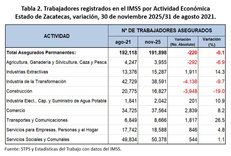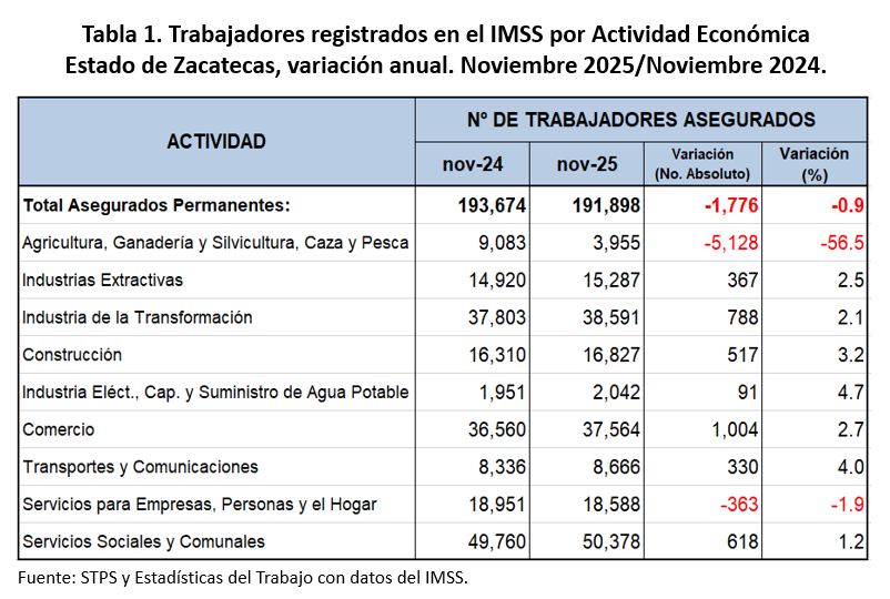 Al cierre de noviembre de 2025 en el estado de Zacatecas se tienen registrados en el IMSS, 191 mil 898 puestos de trabajo. En noviembre Zacatecas presentó un aumento mensual de 1 mil 325 empleos formales, que corresponde a una variación mensual de 0.7 por ciento.