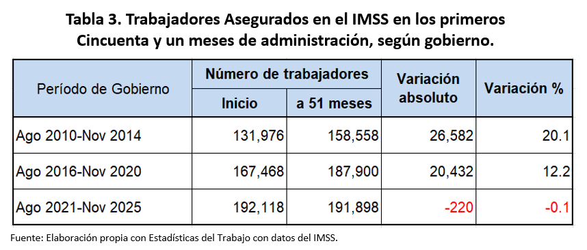 En los cincuenta y un meses de la actual administración (agosto 2021 a noviembre de 2025), se registra la destrucción de 220 puestos de trabajo, pérdida de 4 empleos/mes, mientras que con Miguel Alonso Reyes se generaron en igual período, 26 mil 582, (521 empleos/mes) y con Alejandro Tello Cristerna, se crearon 20 mil 432 (401 empleos/mes). Tabla 3.