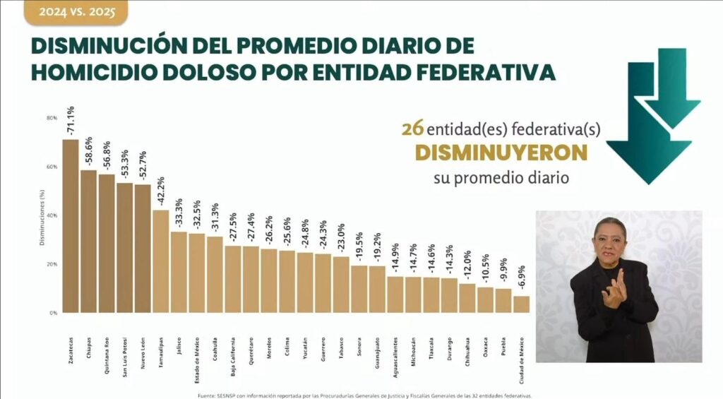 También en materia de seguridad, el Registro Nacional de Personas Desaparecidas y No Localizadas dependiente de la Comisión Nacional de Búsqueda refiere una disminución de hasta 52.71% en el número de casos en el último año, al pasar de 1 mil 70 personas desaparecidas, no localizadas y localizadas en 2024, a sólo 506 casos en 2025.