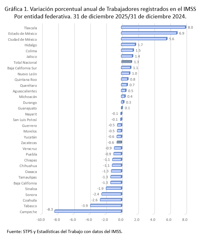 En los últimos doce meses (diciembre 2024 a diciembre 2025) se sumaron 278 mil 697 empleos formales (cuando se deberían generar 100 mil empleos mensuales), lo que representa una variación anual de 1.3 por ciento. dieciocho entidades mostraron caída, las variaciones más elevadas se observan en Tlaxcala, 8.0%; Estado de México, 6.9% y Ciudad de México, 5.6 por ciento. Zacatecas ocupó el lugar veintidós con una variación anual de (-)0.9 por ciento. Gráfica 1.