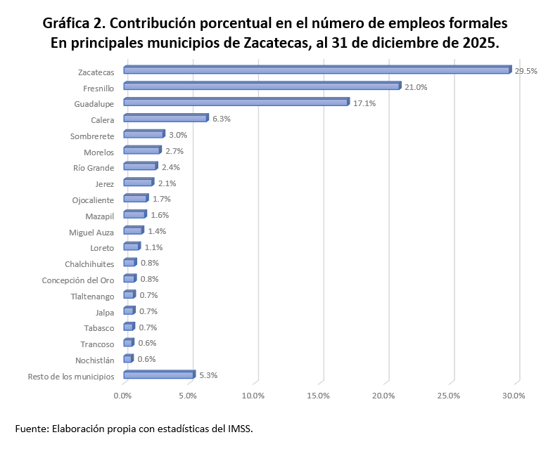 Tan sólo ocho municipios concentran el 84.2% de los empleos formales de la entidad: Zacatecas, 29.5%; Fresnillo, 21.0%; Guadalupe, 17.1%; Calera, 6.3%; Sombrerete, 3.0%; Morelos, 2.7%; Río Grande, 2.4% y Jerez, 2.1 por ciento. Gráfica 2.