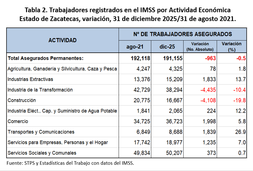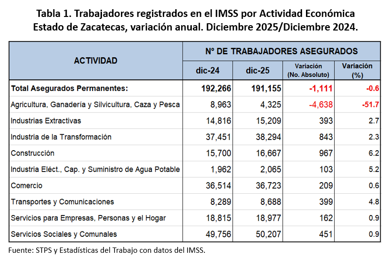 En diciembre Zacatecas presentó una disminución mensual de 743 empleos formales, que corresponde a una variación mensual de 0.4 por ciento. Esta es la segunda caída más baja en los últimos doce años en términos absolutos para un mes de diciembre, ya que en diciembre de 2013 se perdieron 441 empleos. Las mayores pérdidas en el último mes del año 2025 se dieron en el comercio con (-)841; industria de la transformación, (-)297; servicios sociales y comunales, (-)171 y la construcción, (-)170 empleos.