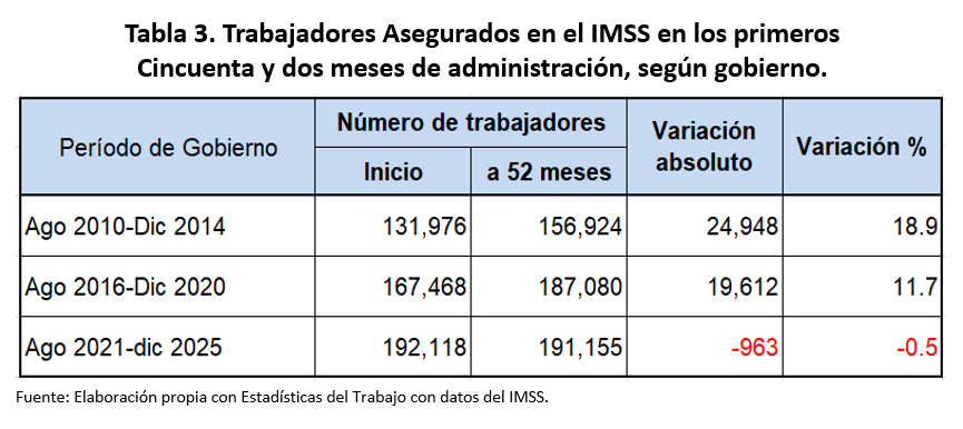En los cincuenta y dos meses de la actual administración (agosto 2021 a diciembre de 2025), se registra la destrucción de 963 puestos de trabajo, pérdida de 19 empleos/mes, mientras que con Miguel Alonso Reyes se generaron en igual período, 24 mil 948, (480 empleos/mes) y con Alejandro Tello Cristerna, se crearon 19 mil 612 (377 empleos/mes). Tabla 3.