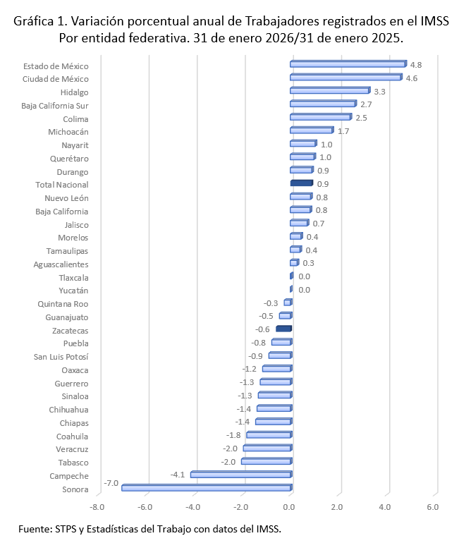 En los últimos doce meses (enero 2025 a enero 2026) se sumaron 197 mil 426 empleos formales, lo que representa una variación anual de 0.9 por ciento. dieciséis entidades crecieron, las variaciones más elevadas se observan en del Estado de México, 4.8%; Ciudad de México, 4.6% e Hidalgo, 3.3 por ciento. Las mayores contracciones se muestran en Sonora, (-)7.0% y Campeche, (-)4.1 por ciento. Zacatecas ocupó el vigésimo lugar con una variación anual de (-)0.6 por ciento. Gráfica 1.