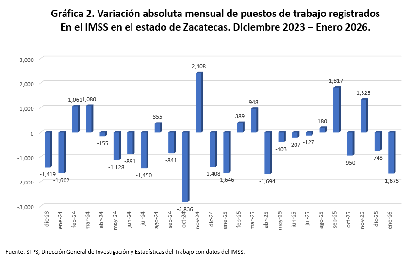 En el primer mes del año Zacatecas presentó una caída mensual de 1 mil 675 puestos de trabajo, este descenso es similar a los registrados en enero de 2024 que se perdieron 1 mil 662 empleos y al de enero 2025 que restó 1 mil 646 plazas. Estas disminuciones son las más altas registradas para un mes de enero. Gráfica 2.