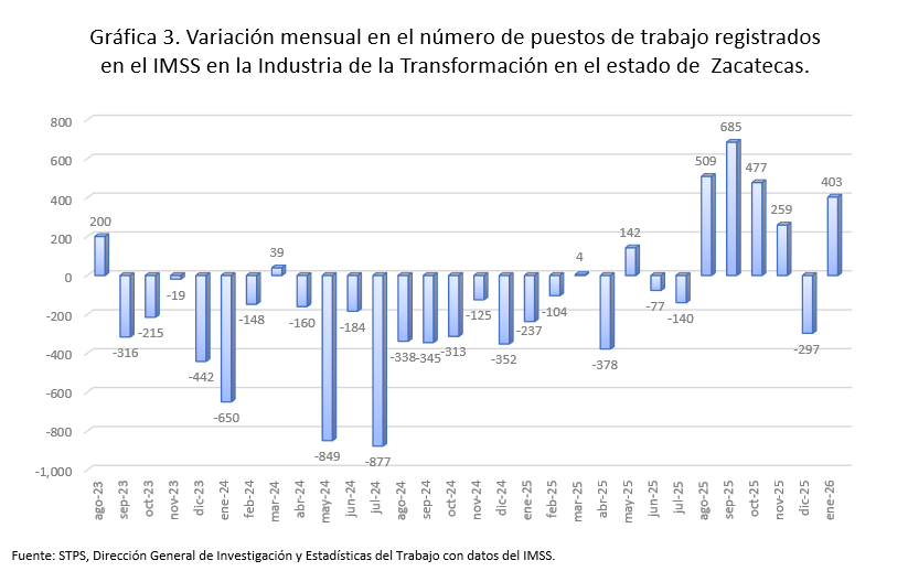 La Industria de la Transformación o Manufacturera, es la actividad que genera más empleos formales en el país, con el 26.1%. En enero de 2026 esta actividad promedió una variación anual de (-)2.1%, Sólo seis entidades crecieron: Chiapas, Baja California Sur, Colima, Zacatecas se ubicó en cuarto lugar con variación de 4.0%; contribuye con el 0.7 por ciento de los empleos en esta actividad y es la segunda empleadora de la entidad con el 20.4 por ciento.