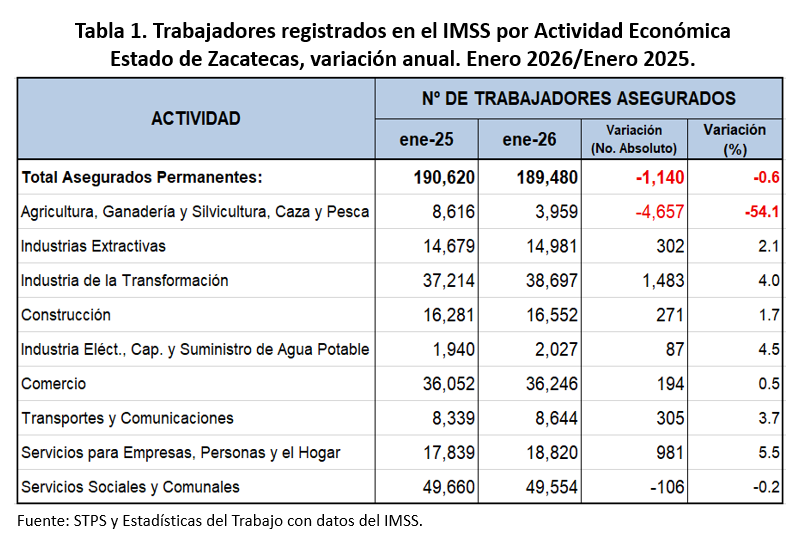 Las Industrias Extractivas agrupan el 0.6% de los puestos de empleo formales, en el último año (enero 2025 a enero 2026) se destruyeron 3 mil 083 empleos, sólo ocho estados mostraron aumentos: Oaxaca, Durango, Chihuahua, Sonora, Yucatán, Zacatecas (sexto lugar con una variación anual de 2.1 por ciento), Hidalgo y Colima. Zacatecas es el principal empleador del país en esta actividad, participa con el 12.0% nacional y con el 7.9% de los empleos de la entidad.