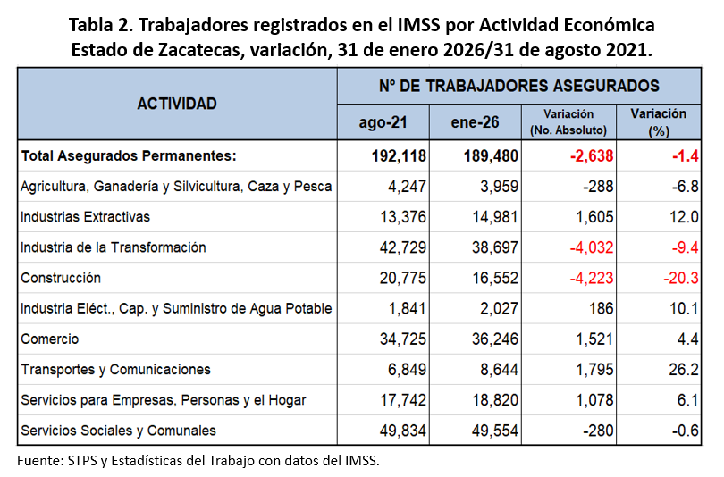 En lo que va de la actual administración (agosto 2021 – enero 2026), se han destruido 2 mil 638 puestos de trabajo, equivalente a una variación en dicho período de (-)1.4 por ciento. la industria de la transformación y la construcción acumulan 8 mil 255 empleos perdidos. Tabla 2.