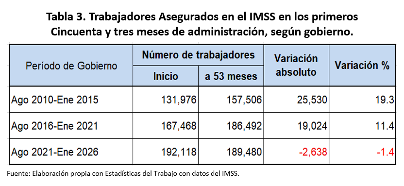 En los cincuenta y tres meses de la actual administración (agosto 2021 a enero de 2026), se registra la destrucción de 2 mil 638 puestos de trabajo, pérdida de 50 empleos/mes, mientras que con Miguel Alonso Reyes se generaron en igual período, 25 mil 530, (482 empleos/mes) y con Alejandro Tello Cristerna, se crearon 19 mil 024 (359 empleos/mes). Tabla 3.