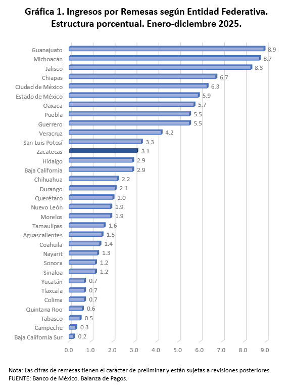 Doce entidades concentraron el 72.1% de las remesas recibidas en 2025, encabezadas por Guanajuato con el 8.9%, desplazando a Michoacán, 8.7%; Jalisco, 8.3%; Chiapas (que ascendió), 6.7%; Ciudad de México, 6.3%; estado de México, 5.9%; Oaxaca, 5.7%; Puebla y Guerrero, 5.5% en forma individual; Veracruz, 4.2%; San Luis Potosí, 3.3% y Zacatecas, 3.1 por ciento. Gráfica 1.
