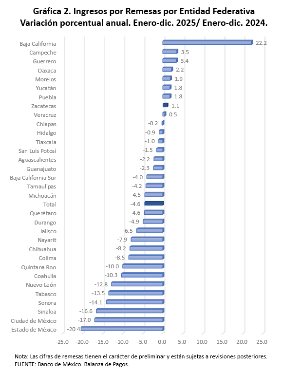 Veintitrés entidades federativas registraron disminuciones anuales en los flujos de remesas durante el año 2025 en comparación con el año 2024. La entidad con mayor crecimiento fue Baja California con una variación anual de 22.2%, Zacatecas se encuentra entre los nueve estados que mostraron crecimiento ocupando el octavo lugar con una variación de apenas 1.1 por ciento.