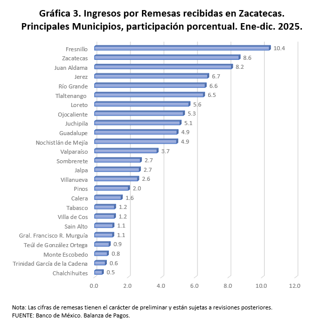 Doce municipios reciben el 76.5% del total de remesas que ingresaron a la entidad en el año 2025, Fresnillo quedó nuevamente a la cabeza como principal receptor de remesas de la entidad con el 10.4% (cabe recordar que en 2024 lo superó por primera vez Juan Aldama), le siguen: Zacatecas, 8.6%; Juan Aldama, 8.2%; Jerez, 6.7%; Río Grande, 6.6%; Tlaltenango, 6.5%; Loreto, 5.6%; Ojocaliente, 5.3%; Juchipila, 5.1%; Guadalupe y Nochistlán, 4.9% cada uno de ellos y Valparaíso, 3.7 por ciento. Gráfica 3.