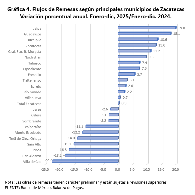 Los municipios que registraron las variaciones anuales más altas por concepto de remesas, durante el año 2025 en comparación con las remesas recibidas en el año 2024, son: Jalpa, 19.8%; Guadalupe, 18.1%; Juchipila, 13.6%; Zacatecas, 13.0%; General Francisco R. Murguía, 11.2%; Nochistlán, 9.6%; Tabasco, 7.4%; Ojocaliente, 7.3%; Fresnillo, 5.7% y Tlaltenango, 3.1 por ciento. Gráfica 4.