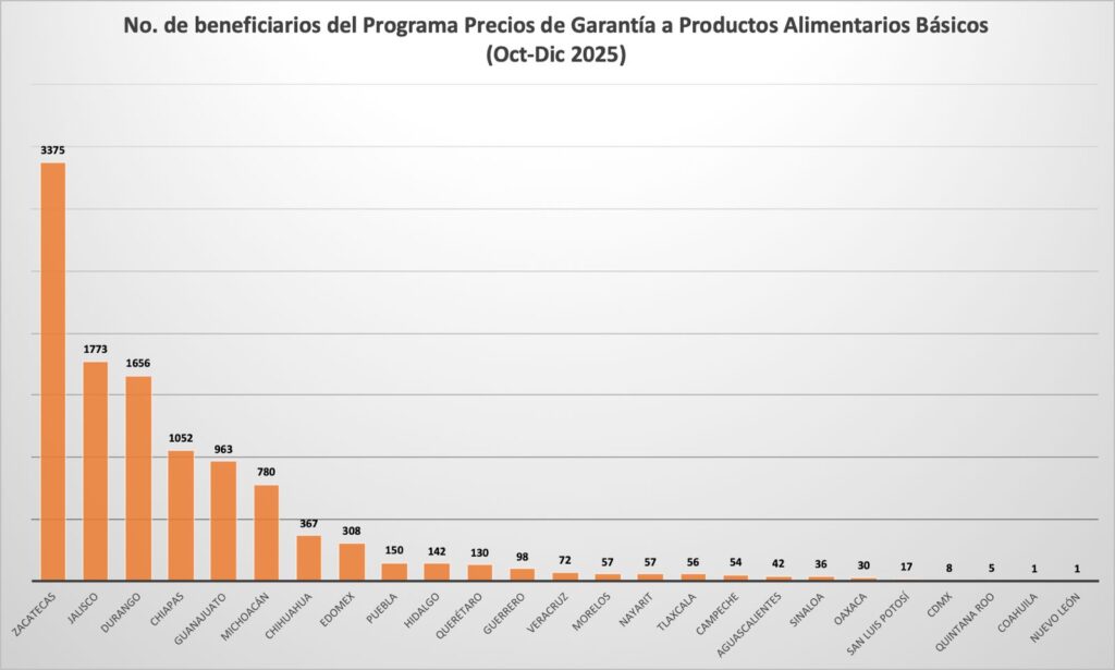 Pero analicemos el periodo más crítico y por el cual se endurecieron las protestas. Entre octubre y diciembre de 2025, Zacatecas fue la entidad con el mayor número de beneficiarios del programa de Precios de Garantía, seguido por Jalisco, Durango y Chiapas; a diferencia de Nuevo León, Coahuila, Quintana Roo y CDMX, que cada una tuvo menos de 10 beneficiarios en el mismo periodo.