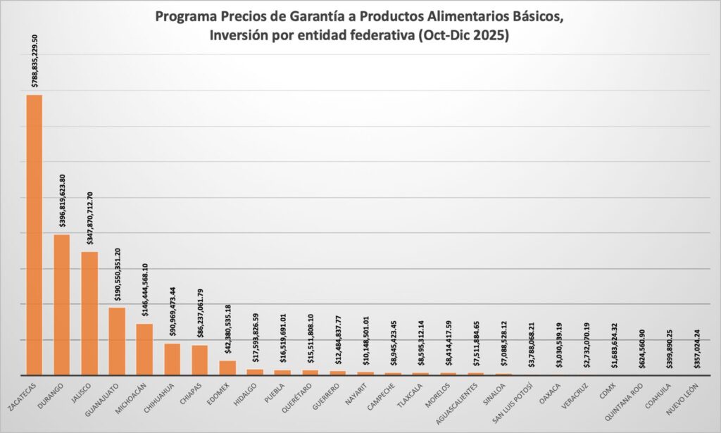 De acuerdo con la plataforma del Padrón Único de Beneficiarios del Gobierno de México, durante todo el 2025 Zacatecas se habría beneficiado con una derrama económica por 1 mil 972 millones 824 mil 335.10 pesos derivado del programa Precios de Garantía a Productos Alimentarios Básicos.