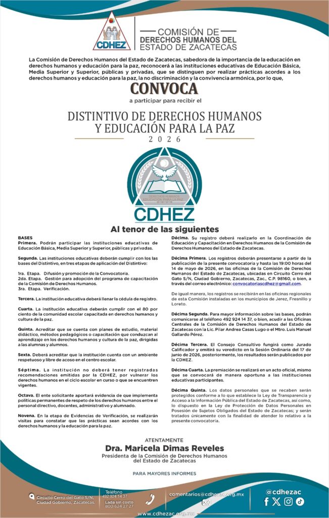 Con el objetivo de fortalecer la cultura de respeto, inclusión y paz en los entornos escolares, la Comisión de Derechos Humanos del Estado de Zacatecas (CDHEZ) lanzó la convocatoria para participar en el Distintivo de Derechos Humanos y Educación para la Paz 2026, dirigida a instituciones educativas de nivel básico, medio superior y superior, tanto públicas como privadas.