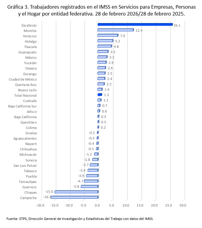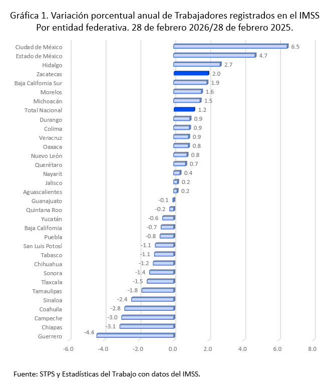 En los últimos doce meses (febrero 2025 a febrero 2026) se sumaron 260 mil 819 empleos formales, lo que representa una variación anual de 1.2 por ciento. Dieciséis entidades crecieron, las variaciones más elevadas se observan en la Ciudad de México, 6.5%; el Estado de México, 4.7%; Hidalgo, 2.7% y Zacatecas que por primera vez se ubicó en el cuarto lugar nacional con una variación anual de 2.0 por ciento. Gráfica 1.