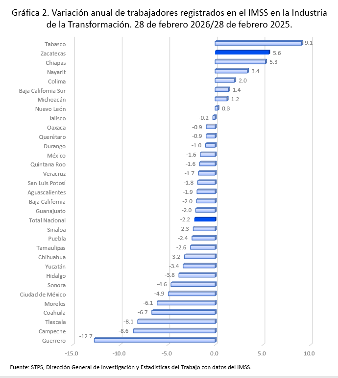 La Industria de la Transformación o Manufacturera es la actividad que genera más empleos formales en el país. En febrero de 2026 esta actividad promedió una variación anual de (-)2.2%, Sólo ocho entidades crecieron, destacando Tabasco con variación de9.1%, Zacatecas en segundo lugar con una variación de 5.6% anual, contribuye con el 0.7% de los empleos del país en esta actividad y es la segunda empleadora de la entidad con el 20.1 por ciento. Gráfica 2.