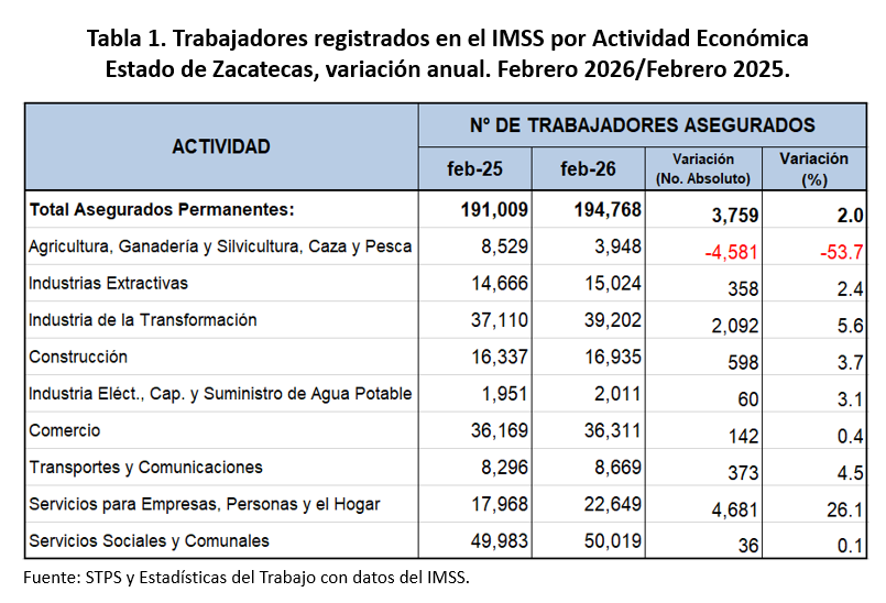 Con lo anterior, la creación de empleos en el primer bimestre de 2026 creció en 174 mil 674 puestos de trabajo, promediando una variación de 0.8%, veintisiete estados crecieron en el primer bimestre, Zacatecas registró una variación de 1.9 por ciento.