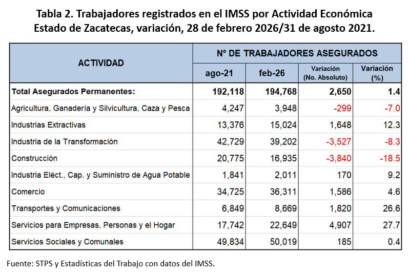En febrero de 2026, la Construcción promedió una variación anual de (-)1.4%, nueve entidades mostraron aumentos, destacando: Tlaxcala, 26.6%; Ciudad de México, 9.3%; Michoacán, 8.2% y Zacatecas que registró una variación anual de 3.7% y se ubicó en cuarto lugar. Zacatecas participa con el 1.0% de los empleos del país en esta actividad y con el 8.7% de los empleos formales de la entidad.