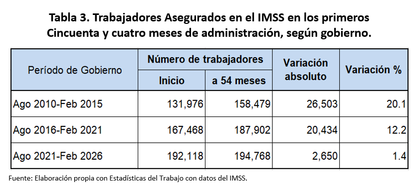 En los cincuenta y tres meses de la actual administración (agosto 2021 a enero de 2026) se registra un aumento de 2 mil 650 puestos de trabajo, creación de 49 empleos/mes en promedio, mientras que con Miguel Alonso Reyes se generaron en igual período 26 mil 503, (491 empleos/mes) y con Alejandro Tello Cristerna se crearon 20 mil 434 (378 empleos/mes). Tabla 3.